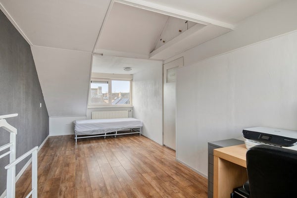 Slaapkamer 4, een ruime zolderkamer, met aan de voor- en achterkant een dakkapel welke beide zijn voorzien van rolluiken, bergruimte achter de knieschotten en toegang tot de bergvliering.