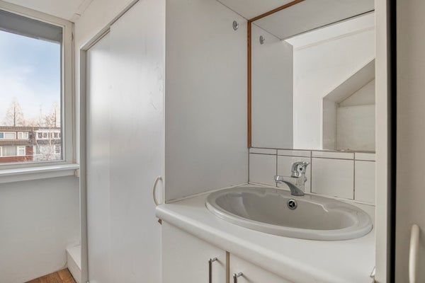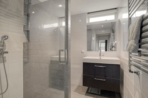 Badkamer, geheel betegeld, voorzien van een douchecabine met thermostaatkraan, rainshower, en handdouche, wastafel met onderladen, een tweede toilet (hangend closet), een te openen raam, elektrische afzuiging en een badkamerradiator.