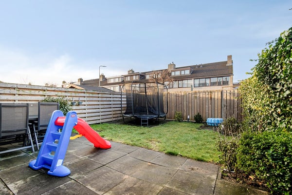Achtertuin, voorzien van groen, terrastegels en een gazon. De tuin beschikt over een elektrische zonwering, een achteruitgang en biedt toegang tot de zij-tuin.