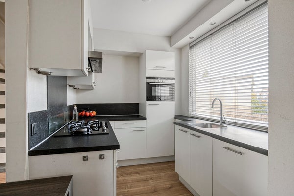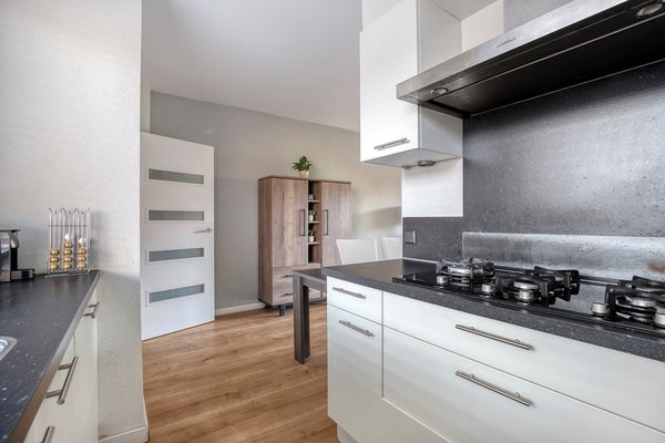 Keuken, een half open keuken, gelegen aan de voorzijde van de woning, voorzien van een 5-pits gaskookplaat met afzuigkap, koelkast, combi-oven, vaatwasser en close-in boiler.