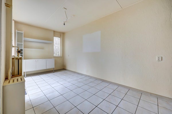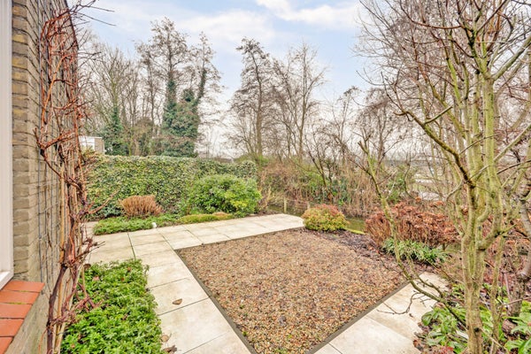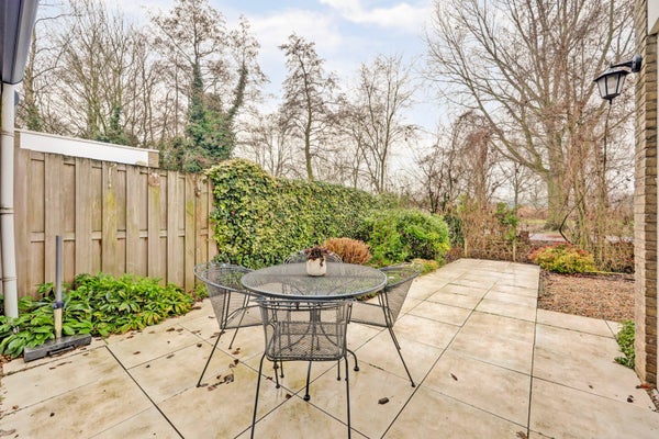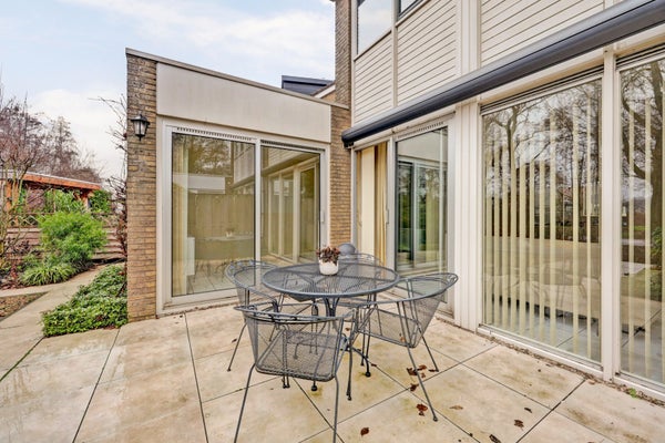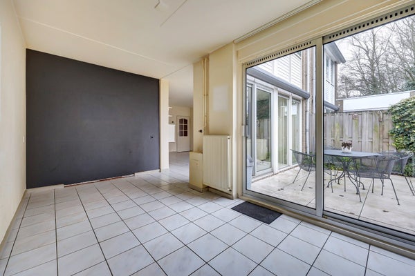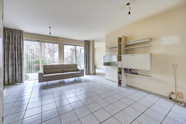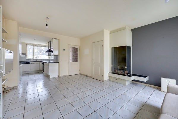 De ruime, tuingerichte woonkamer is heerlijk licht dankzij de grote aluminium raampartijen. De open haard zorgt voor extra sfeer en de trapkast biedt handige bergruimte. Via de aluminium schuifpuien in zowel de woon- als eetkamer loopt u zo de achtertuin in.