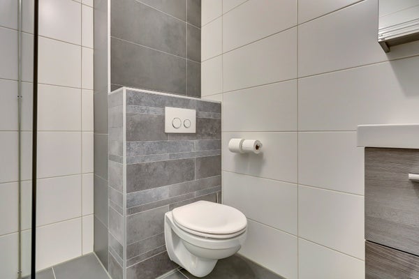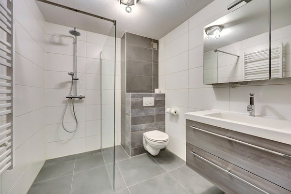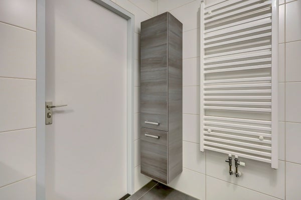 De moderne, volledig betegelde badkamer (2021) is uitgerust met een inloopdouche (met regen- en handdouche), een breed wastafelmeubel met spiegel, een tweede wandcloset en een praktische handdoekenkast.