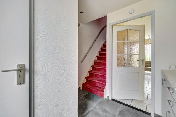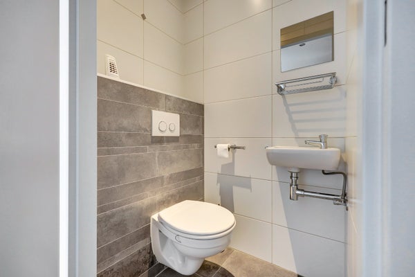 Entree, ruime hal met meterkast. Modern betegeld toilet met wandcloset en fonteintje. Vanuit de hal is de trap naar boven en biedt deze toegang tot de woonkamer.