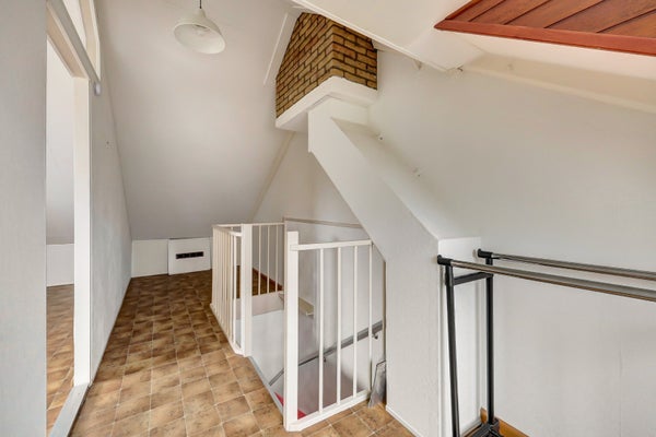 De overloop met vaste kast geeft toegang tot twee ruime slaapkamers, de badkamer en de trap naar de tweede verdieping.