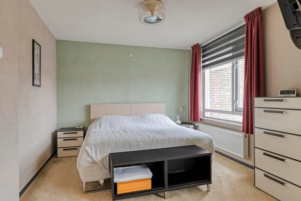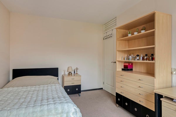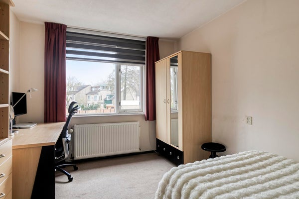 Op de eerste verdieping kom je op een ruime overloop die toegang geeft tot drie slaapkamers, een praktische opbergkast en de badkamer. De grootste slaapkamer ligt aan de voorzijde en beslaat de volledige breedte van de woning. Aan de achterzijde bevinden zich nog twee ruime slaapkamers. Alle kamers zijn voorzien van dubbel glas en vloerbedekking. De badkamer is compleet uitgevoerd met een ruime inloopdouche, wastafelmeubel, vloerverwarming en een toilet.