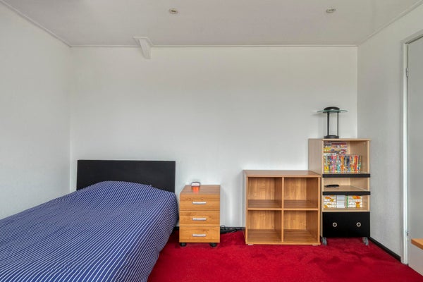 Via de overloop bereik je de vierde slaapkamer, eveneens netjes afgewerkt met vloerbedekking. Op de overloop vind je de wasmachineaansluiting en verrassend veel bergruimte ideaal voor een gezin of thuiswerkplek.
