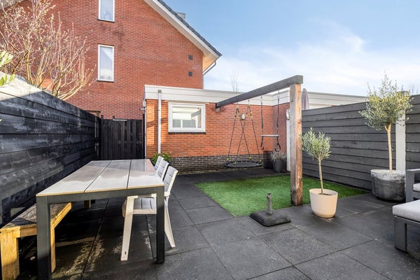 Achtertuin, gelegen op het zuiden, waardoor heel de dag genieten van de zon! De tuin is voorzien van vernieuwde sierbestrating en schuttingen (2020), kunstgras, elektrische zonwering, buitenkraan, stenen berging met elektriciteit en verlichting, dubbele schommel en een achterom.
