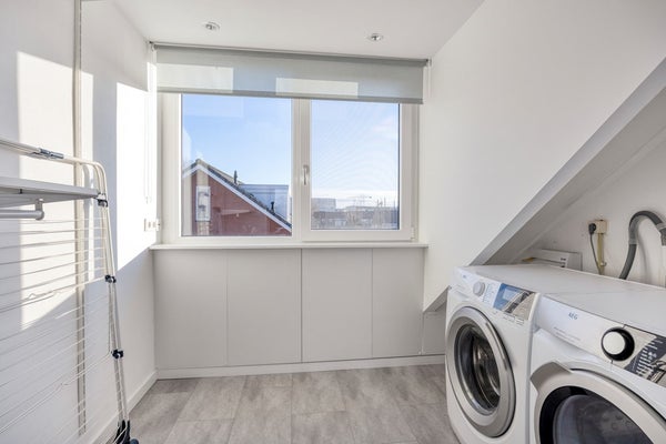 Witgoedruimte, gelegen aan de achterzijde, voorzien van elektrische rolluiken. Voorzien van de wasmachine- en drogeraansluiting en de opstelling van de omvormer voor de zonnepanelen. De vloer is afgewerkt met vinyl.