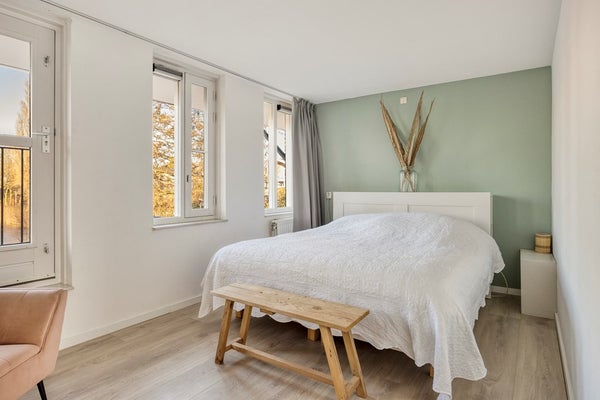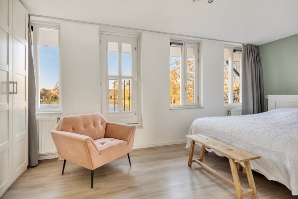 Slaapkamer 1, een royale kamer aan de voorzijde met super uitzicht over de vijver, voorzien van een Frans balkon. Hier is het heerlijk wakker worden!
