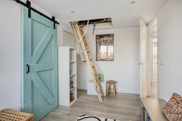 Slaapkamer 5, gelegen aan de voorzijde, voorzien van een vaste kast en een technische ruimte/kast met de opstelling van de cv-ketel en mechanische ventilatie unit. Verder is er vanuit deze kamer een tweede toegang naar de bergzolder via een vlizotrap.
