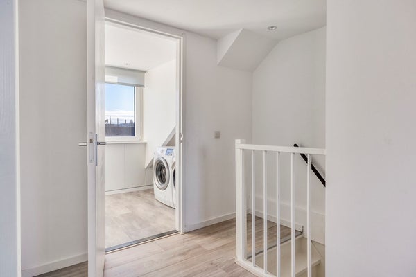 Overloop, met toegang tot 3 slaapkamers, separate witgoedruimte, bergruimte achter de knieschotten en de bergzolder via een vlizotrap.