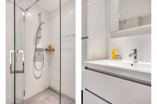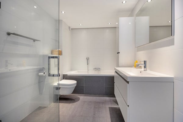 Badkamer (2018), een royale en geheel betegelde ruimte, voorzien van een groot ligbad met thermostaatkraan en handdouche, inloopdouche met thermostaatkraan, badkamermeubel met een brede wastafel, voorzien van onderladen en een kolomkast. Verder beschikt de badkamer over een tweede toilet (hangend closet), elektrische vloerverwarming en mechanische ventilatie.