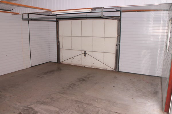 Achter de berging is een houten garage met kantelpoort geplaatst (27m2)