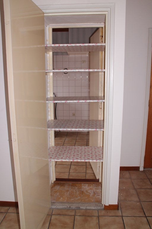 Hal met toilet, trap naar de verdieping, kelderkast en meterkast (4 groepen en 1 aardlekschakelaar). Woonkeuken met keukenblok en bovenkasten. Ruimte en aansluiting voor een gaskooktoestel. Er is een doorgeefkast naar de woonkamer (22m2).