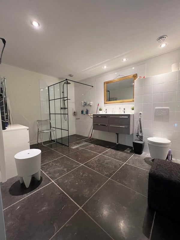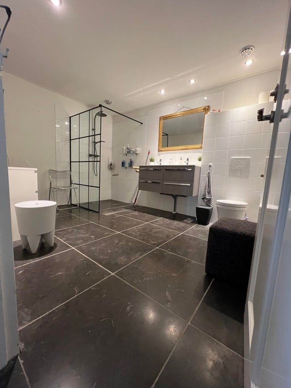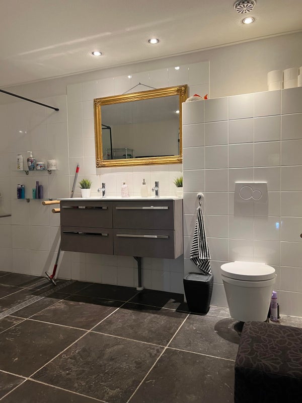 De badkamer van 11m² is functioneel ingericht met een dubbele wasbak, een separaat toilet, een ruime douche, extra kastruimte en bijbehorende meubelstukken voor een nette afwerking.