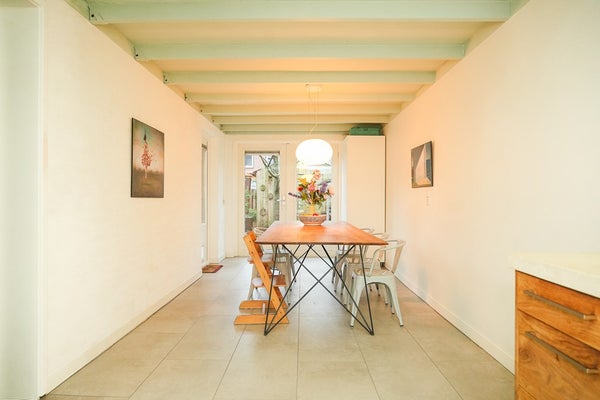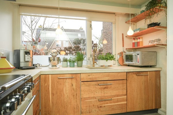 Dankzij de raampartij aan de voorzijde, de openslaande deuren achter en losse deur naar de achtertuin is de keuken heerlijk licht en staat binnen in directe verbinding met buiten.