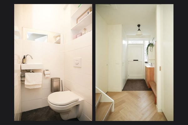 Je komt binnen via de entree in een nette hal met op maat gemaakte garderobekasten, meterkast en een modern toilet met zwevend toilet en fonteintje. De gehele begane grond is afgewerkt met een moderne PVC visgraatvloer in combinatie met vloerverwarming. Comfortabel en stijlvol.