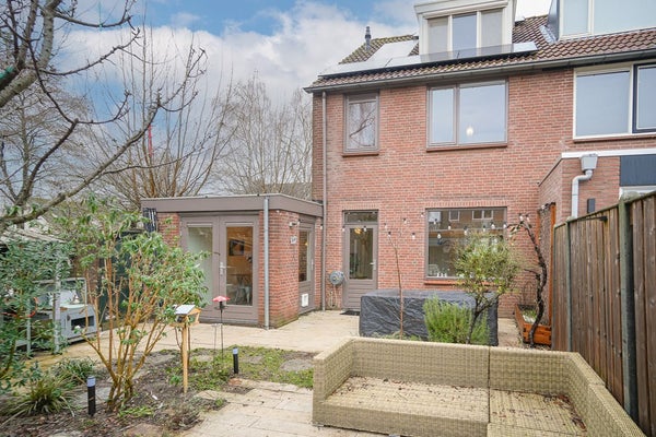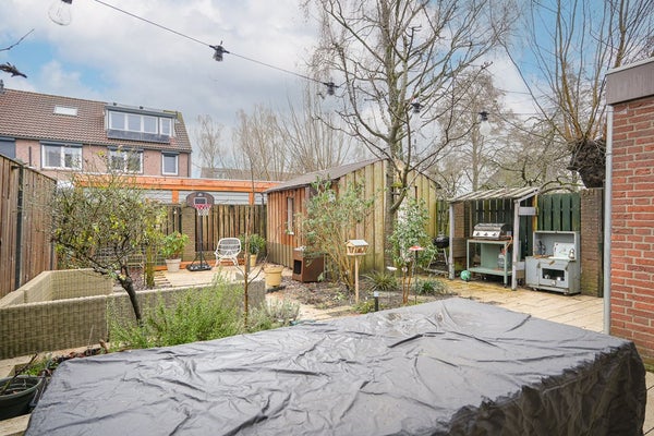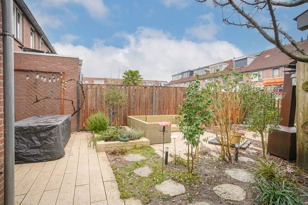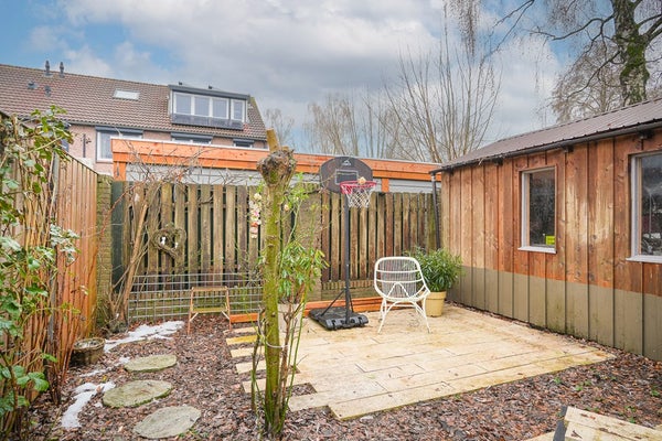 De achtertuin is gelegen op het zuidoosten en beschikt over een terras, borders en een ruime vrijstaande berging met elektra. Een fijne plek om te ontspannen, te spelen of gezellig te barbecueën.