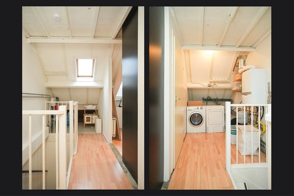 De tweede verdieping biedt verrassend veel ruimte. Op de voorzolder bevinden zich de cv-opstelling (Vaillant 2016), zonneboiler, wasmachine- en drogeraansluiting, mechanische ventilatie en de omvormer van de zonnepanelen.
