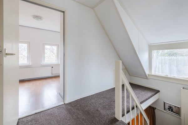 Overloop met kleine bergruimte achter knieschotten, 2 slaapkamers 1 aan voorzijde en 1 aan achterzijde.