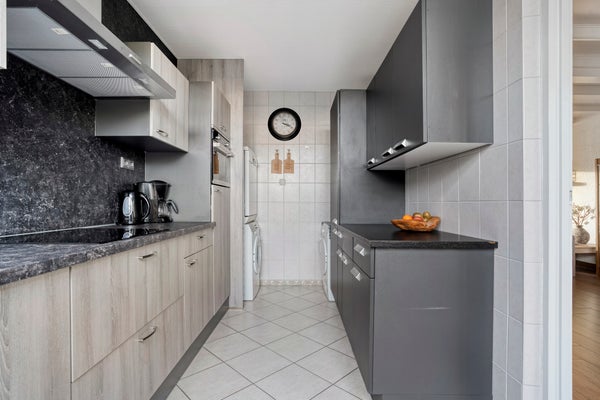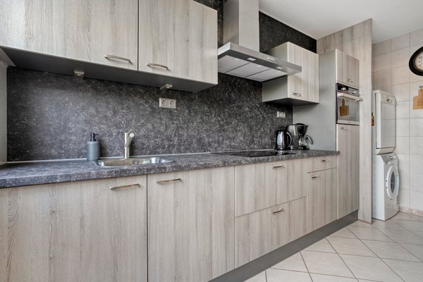 De begane grond omvat een lichte woonkamer met keramisch parket en een vernieuwde keuken uitgerust met inbouwapparatuur, inclusief een inductiekookplaat. De eerste verdieping herbergt de slaapkamers en een volledig betegelde badkamer.