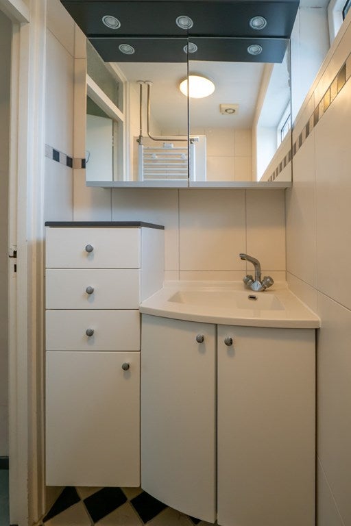 Overloop, separaat toilet, douche met wastafelmeubel en designradiator, 3 slaapkamers met vaste kasten.