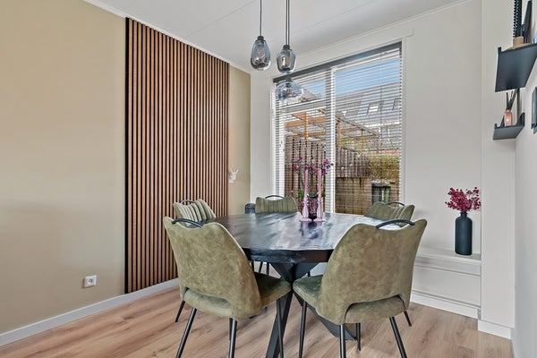 Via de voordeur kom je in de hal met meterkast (voorzien van 6 groepen en 2 aardlekschakelaars), garderobe en toiletruimte. De moderne toiletruimte is voorzien van wandcloset en een plateau voor accessoires. Vervolgens bereik je de lichte en sfeervolle woonkamer met aan de voorzijde een groot kunststof kozijn met HR++ beglazing, nette laminaat vloer, gestucte wanden met gedeeltelijk aangebrachte wandpanelen, een trapkast en afgesloten trap. Het zitgedeelte bevindt zich aan de voorzijde en biedt voldoende plek voor een leuke hoekbank. De eethoek is aan de achterzijde van de woning te vinden, evenals de keuken. De keuken in rechte opstelling bevindt zich gedeeltelijk in de uitbouw en is voorzien van diverse inbouwapparatuur, waaronder een gaskookplaat, afzuigkap en combimagnetron. Daarnaast is er ruimte gereserveerd voor een vaatwasser. Aansluitend bevindt zich de ruime bijkeuken, een zeer praktische toevoeging aan de woning. Hier is volop plaats voor een vriezer of koelkast, een tweede garderobe en extra bergruimte door de aanwezigheid van een grote kast die in de woning achterblijft. Vanuit de bijkeuken heb je toegang tot de diepe achtertuin van maar liefst 13 meter! In de tuin bevindt zich een aangebouwde stenen berging met opstelplaats voor de C.V. ketel (Vaillant; 2020). De berging is praktisch en ideaal voor het stallen van fietsen, het opbergen van tuinkussens en gereedschap. Achterin de tuin is recent een sfeervolle veranda geplaatst; een fijne plek waar je gezellig kunt zitten en aan het einde van de middag nog heerlijk van de zon kunt genieten! De achtertuin is tevens te bereiken via de poort te bereiken.