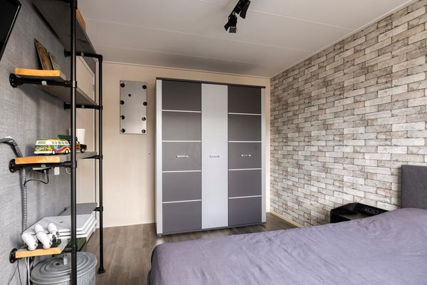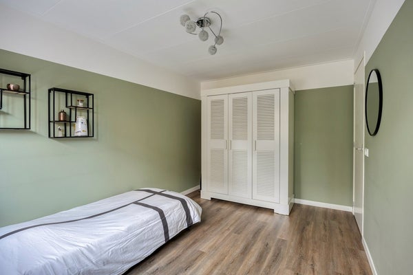 De ruime slaapkamer ligt aan de voorzijde van de woning en is voorzien van een vaste schuifdeurkast.