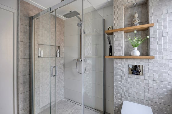 De luxe badkamer (2020) is voorzien van elektrische vloerverwarming, een inloopdouche, een breed wastafelmeubel en een wandtoilet.
