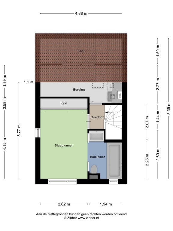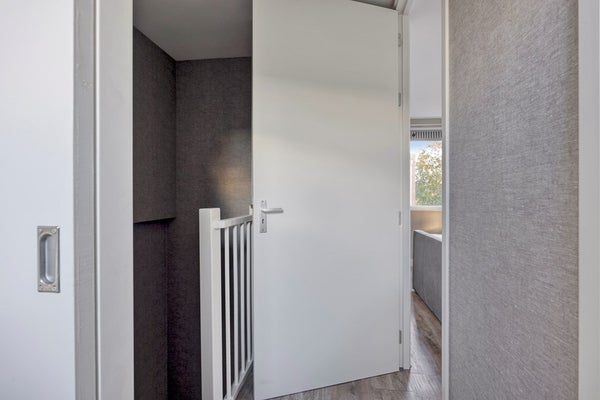 De overloop geeft toegang tot de slaapkamer met badkamer en de zolderruimte.