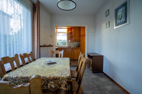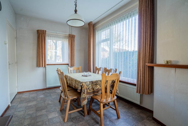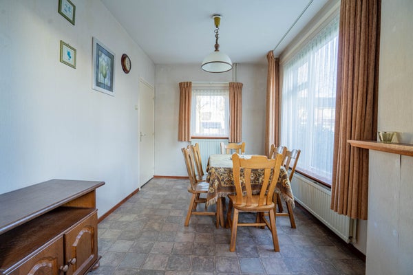 Aansluitend aan de keuken vindt u een royale eetkamer. Ook hier zorgen grote raampartijen voor veel lichtinval. De vinyl vloer en behangen wanden geven de ruimte een praktische basis; een fijne extra kamer voor uitgebreid tafelen of werken aan huis.