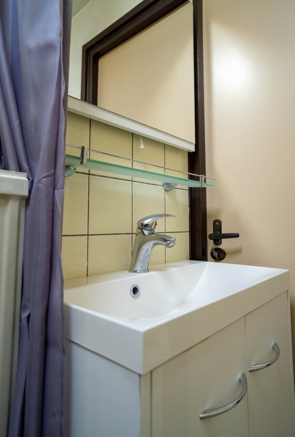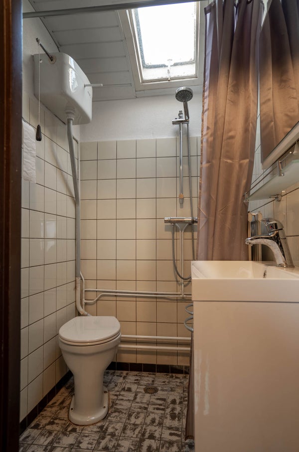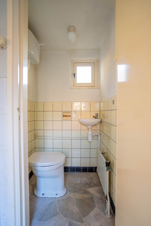 Eenvoudig ingericht met toilet, douche en wastafel. De vloer is betegeld, de wanden deels betegeld. Natuurlijke ventilatie via een raam. Ook hier kunt u moderniseren naar eigen smaak.