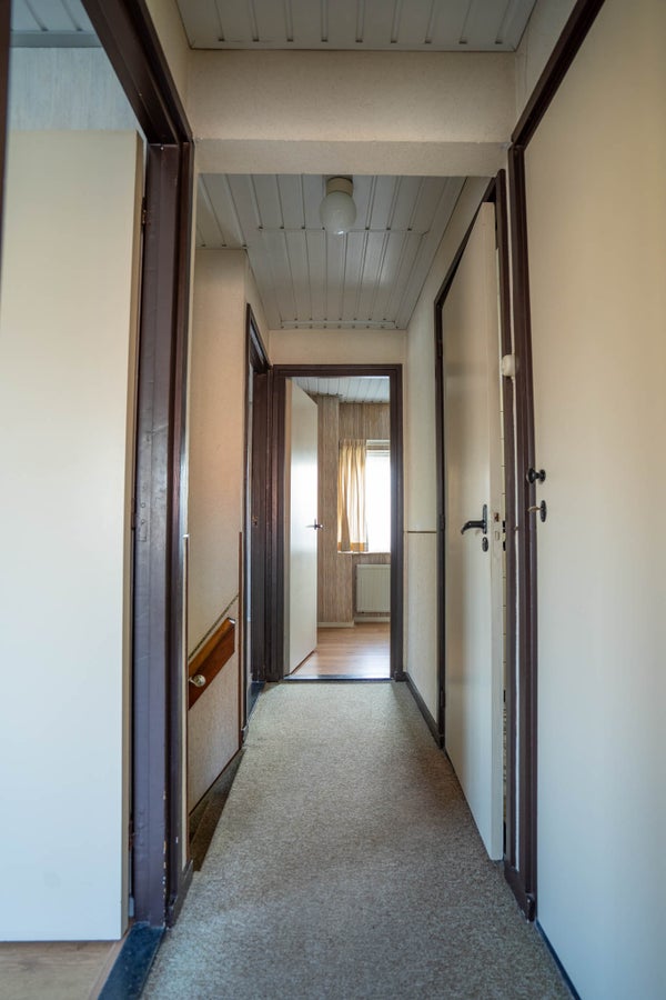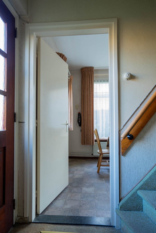 U komt binnen in de hal, die toegang biedt tot de woonkamer, de eetkamer en de trapopgang naar de verdieping. De hal is voorzien van vloerbedekking en heeft half gestuukte/half behangen wanden.