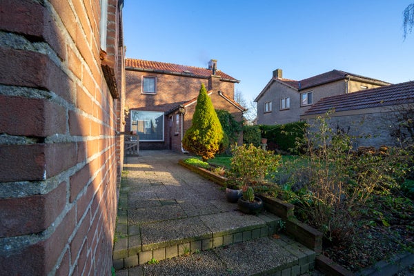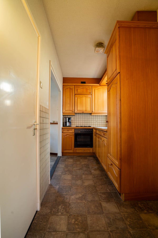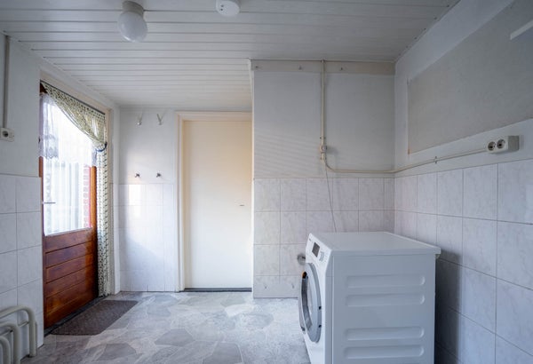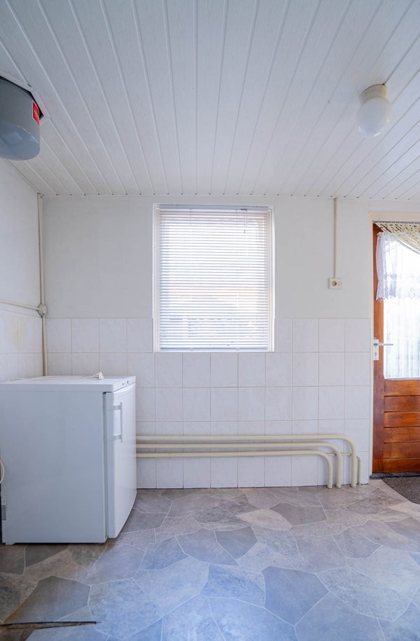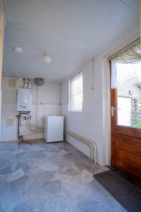 Vanuit de keuken loopt u door naar de bijkeuken met vinyl vloer, half betegelde wanden, opstelling voor witgoed en de cv-installatie. Extra bergruimte maakt dit een bijzonder praktische plek.