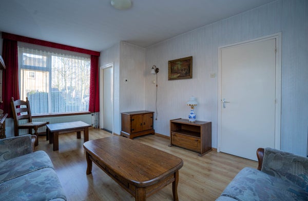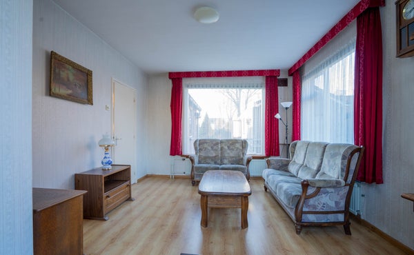 Een knusse, fijne woonkamer met laminaatvloer en behangen wanden. Dankzij de grote raampartijen valt hier veel natuurlijk licht binnen—een prettige leefruimte voor elk moment van de dag.