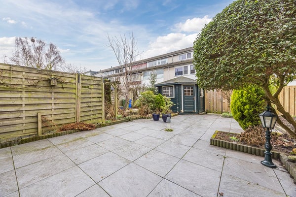 De achtertuin is zonnig op het westen gelegen en voorzien van terras, groenborders, kraantje, achterom, houten berging en elektrisch zonnescherm.