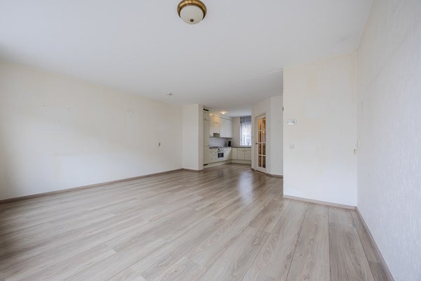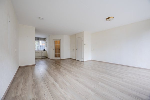 Toegang tot de woonkamer met schuifdeur naar de tuin en aan de voorzijde gelegen keuken.