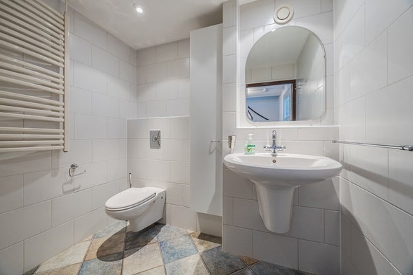 • De badkamer is voorzien van een inloopdouche, 2e toilet met zwevend closet, wastafel, designradiator en inbouwverlichting.