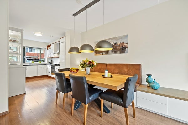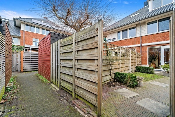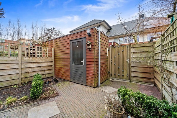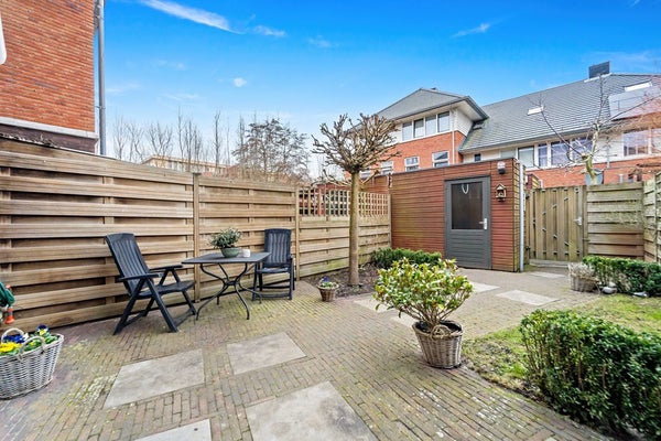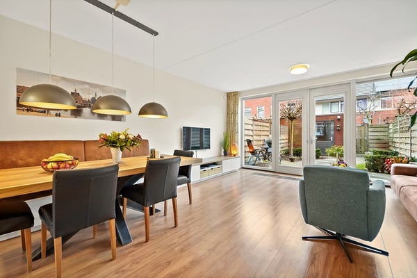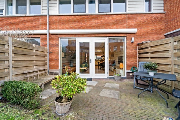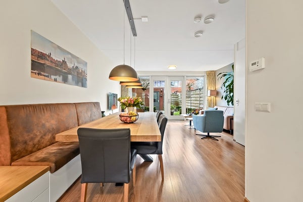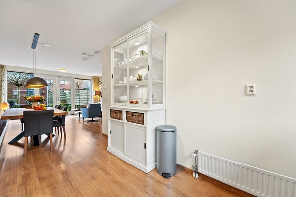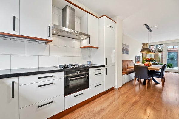 Entree, hal met meterkast, garderoberuime, toiletruimte met fonteintje en trap naar 1e verdieping. De woning beschikt over een lichte, tuingerichte woonkamer met dubbele deuren naar de zonnige achtertuin. De fraai aangelegde achtertuin biedt volop ruimte om te ontspannen, te spelen of gezellig buiten te eten, mede dankzij de zonnige zuidwest ligging. Achterin de tuin bevindt zich een praktische fietsenberging. De tuin is aan de achterzijde ontsloten via een brede poort. Aan de voorzijde van de woning bevindt zich de moderne keuken. Deze keuken is in 2025 gerenoveerd en is voorzien van diverse moderne inbouwapparatuur, waaronder een koel-vriescombinatie, 4 pits gaskookplaat, combi oven/magnetron, vaatwasser en afzuigkap. Een fijne ruimte met een moderne, frisse uitstraling, helemaal klaar voor vele jaren kookplezier. De gehele begane grond is voorzien van een laminaatvloer.