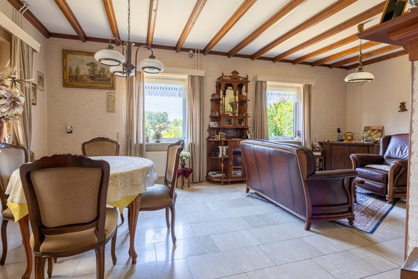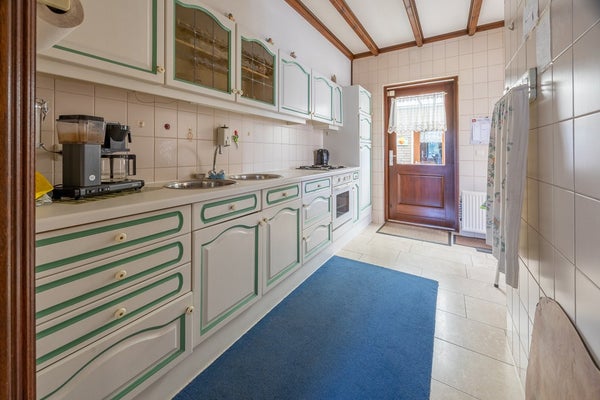 Vanuit deze centrale hal zijn de werkkamer, de slaapkamer op de begane grond, de originele badkamer en de royale woonkamer direct bereikbaar. De keuken sluit perfect aan bij de sfeer van het huis en staat via een brede toog in verbinding met de ruime eetkamer. Hierdoor ontstaat een fijne, open leefruimte met zichtlijnen die passen bij comfortabel en gezellig wonen.