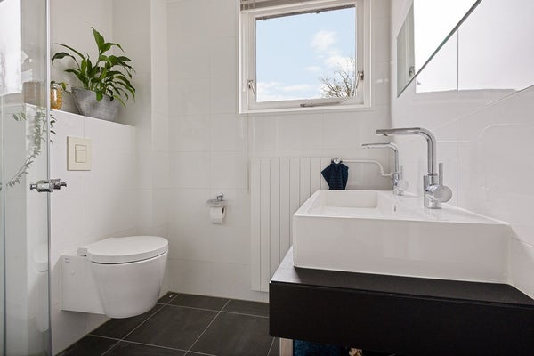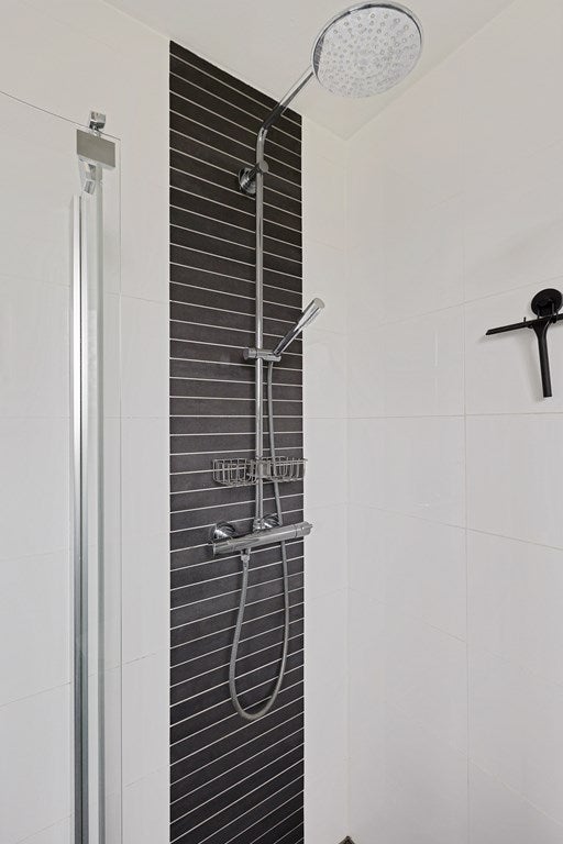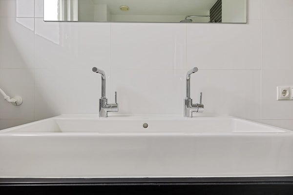 De badkamer is compleet uitgevoerd met een separate douche, een wastafelmeubel en een toilet. Er is een raam aanwezig voor daglicht en natuurlijke ventilatie.