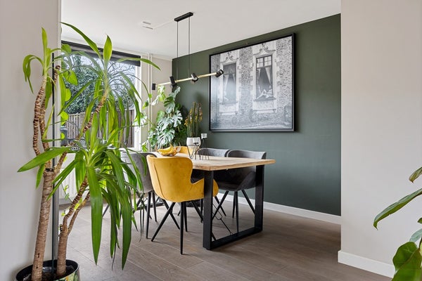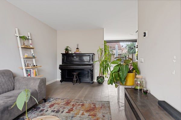 De woonkamer is ruim en heerlijk licht door de grote raampartijen aan de voorzijde. Op de begane grond ligt een echte houten vloer, die warmte en sfeer toevoegt. Richting de achterzijde is er volop plek voor een ruime eethoek, met een prettige verbinding naar de keuken.