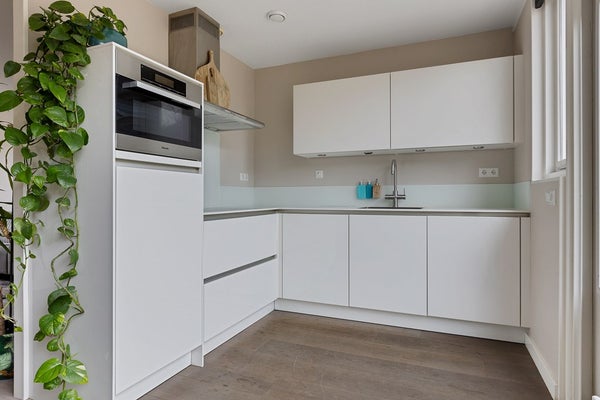 De keuken is open en praktisch ingericht en beschikt over hoogwaardige Miele inbouwapparatuur, waaronder een vaatwasser, ijskast, inductiekookplaat en combioven,magnetron. Daarnaast is de keuken voorzien van een wastafel met kraan en een afzuigkap. Vanuit de keuken is de achtertuin bereikbaar, ideaal wanneer u binnen en buiten graag met elkaar verbindt.