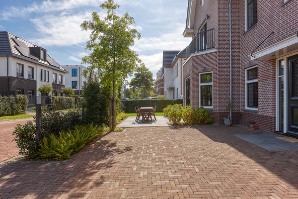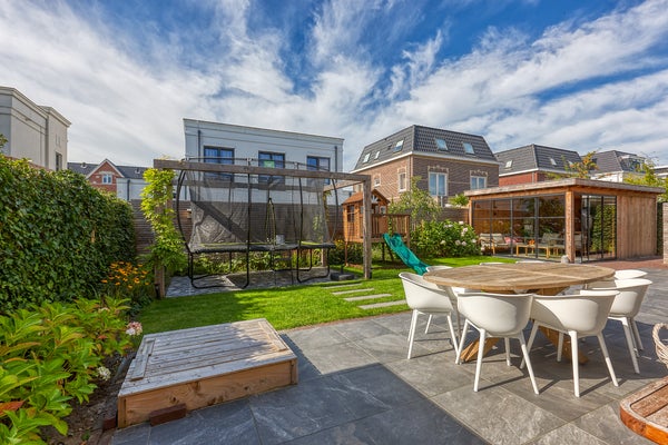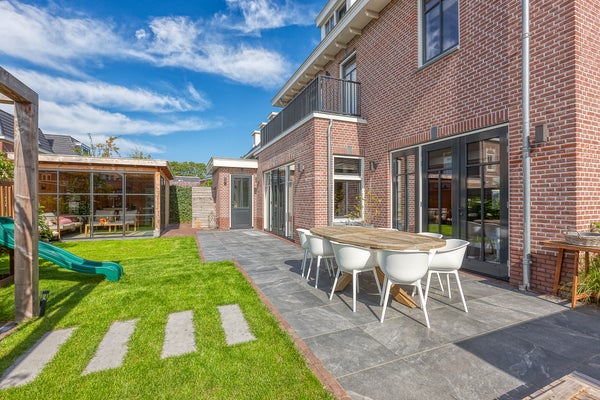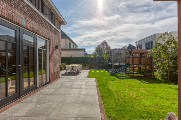 Aan de voorzijde van het huis is er een opstelplaats voor meerdere auto’s en een terras welke toegankelijk is vanuit de eetkamer. De achtertuin, gelegen op het Zuid-Westen, beschikt over een terras, een sfeervol tuinhuis waar het heerlijk vertoeven is, en een speelplaats. De achtertuin is aan de zijkanten van het huis af te sluiten met een hekje, wat extra veiligheid biedt voor kinderen en/of huisdieren. De tuin is voorzien van tuinverlichting en een sprinklersysteem. Het huis is volledig belicht in de avond door middel van een tijdklok.
