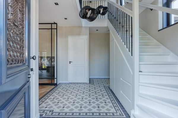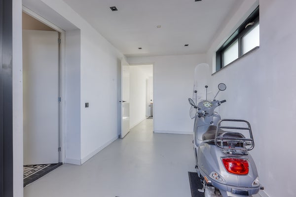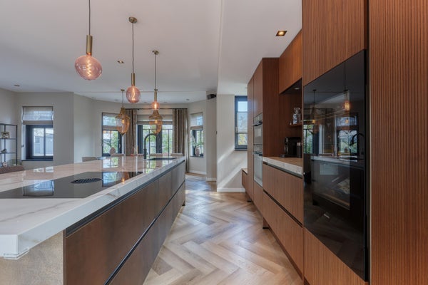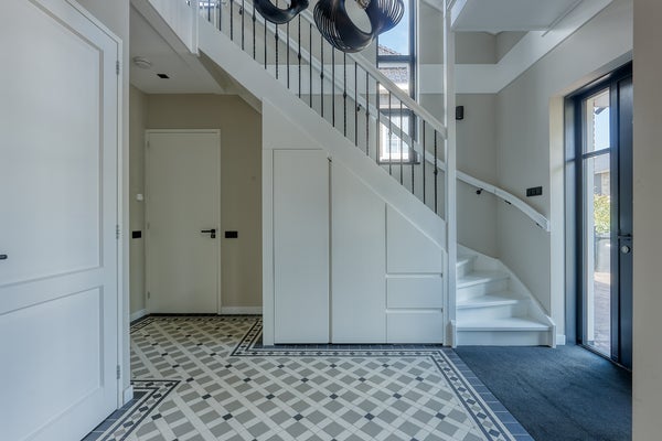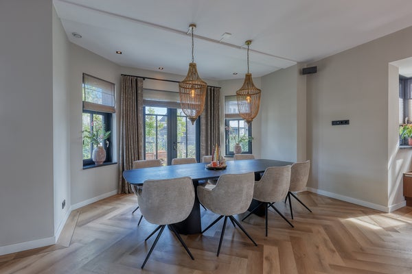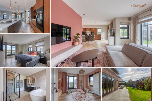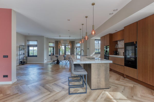 Bij binnenkomst valt de zeer ruime hal met het prachtig open trappenhuis op, met een fraaie Portugese tegelvloer, een toilet met fonteintje en veel ingebouwde opbergruimte waaronder een garderobekast. Vanuit de hal leiden openslaande deuren naar de eetkamer, woonkeuken en zitkamer, die zijn voorzien van een PVC vloer. Vanuit de hal is ook de garage bereikbaar, met een achterliggende ruimte ideaal als kantoor, fitnessruimte of bijkeuken. De woonkeuken vormt het hart van de woning en is centraal gelegen tussen het eetgedeelte en de zitkamer, wat zorgt voor een prettige en ruime leefflow. De keuken met kookeiland is deels uitgevoerd in hout en beschikt over een aparte koelkast, vrieskast, 2 combi-oven magnetrons, een wijnkoeler, vaatwasser, een Quooker en een BORA inductiekookplaat met geïntegreerd afzuigsysteem. Het stoere composiet aanrechtblad maakt het geheel af en benadrukt de hoogwaardige afwerking.