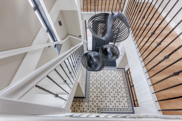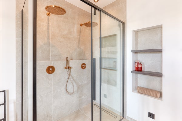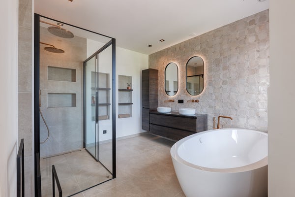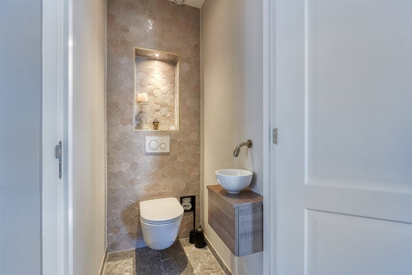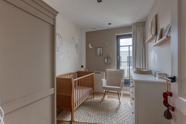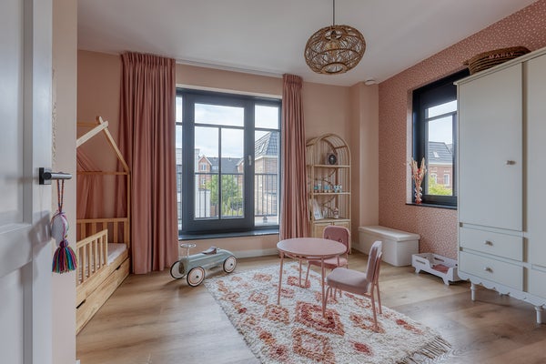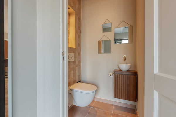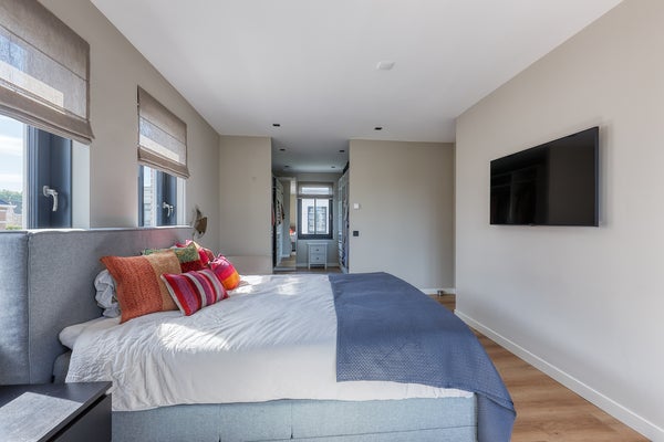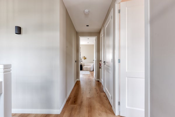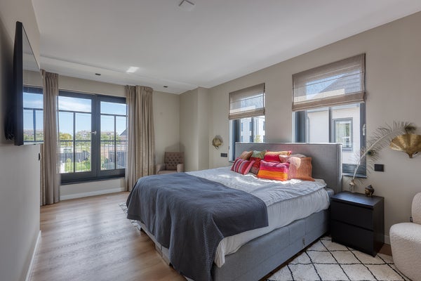De trap naar de eerste verdieping is een echte eyecatcher, dankzij het vele daglicht door de grote ramen in de zijgevel. Op deze verdieping vind je een overloop met twee slaapkamers aan de achterzijde met toegang tot het balkon, en een prachtige hoofdslaapkamer met inloopkast en tevens toegang tot een balkon. De hoofdslaapkamer grenst aan een zeer luxe, volledig uitgevoerde badkamer met een dubbele regendouche, een vrijstaand ligbad, dubbele wastafel met wasmeubel, alles uitgevoerd in natuurlijke kleuren met een mooie tegelwand en speelse nisjes in diverse muren. Zowel de hoofdslaapkamer als de badkamer zijn voorzien van elektrische raambekleding. Apart toilet en fonteintje op de overloop.