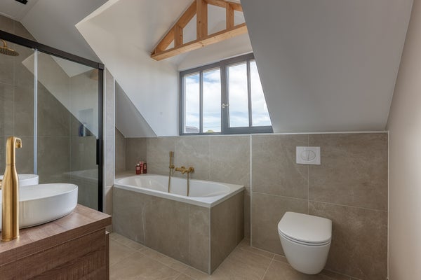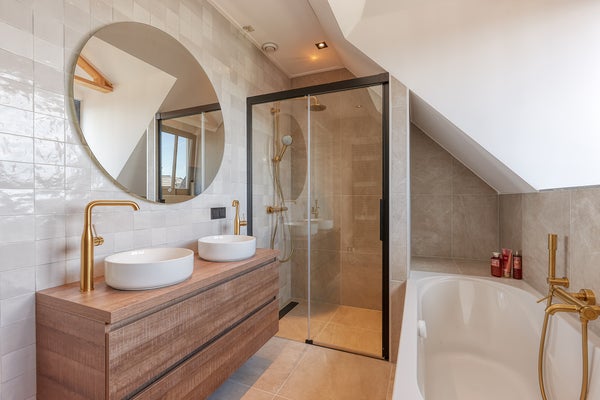 Middels de trap bereik je de overloop van de bovenste verdieping, met twee ruime slaapkamers aan de achterzijde en een sfeervolle slaapkamer aan de voorzijde, waarbij de mooie houten dakconstructie deels zichtbaar is. Op deze verdieping bevindt zich wederom een prachtige ruime badkamer met ligbad, dubbele wastafel met wasmeubel, een aparte douche en toilet. Aparte stookruimte met mechanische ventilatie-unit en opstelplaats voor de wasmachine.