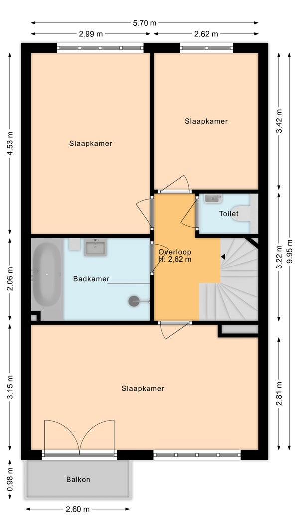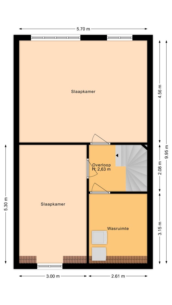 - De tussenwoning heeft een woonoppervlakte van 186 m² en beschikt over 6 kamers, waarvan 5 slaapkamers;