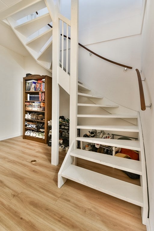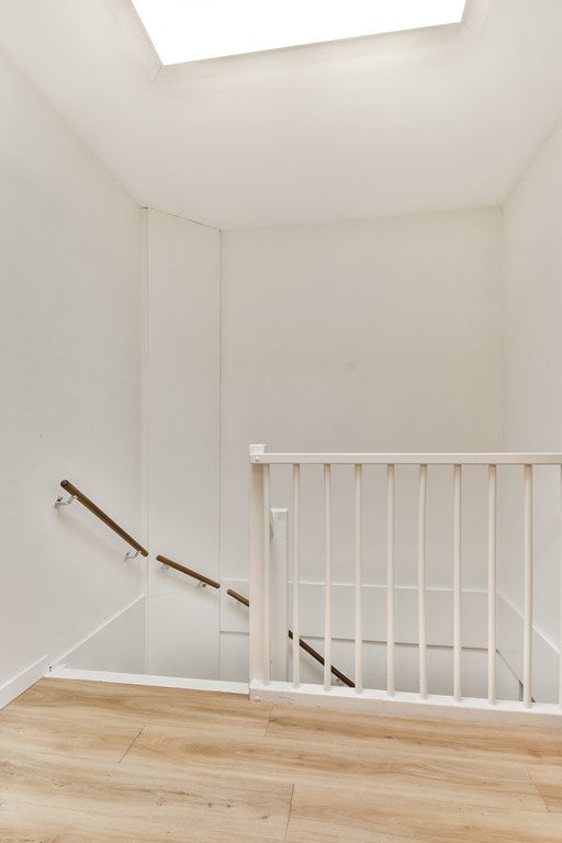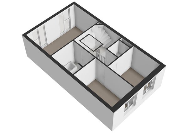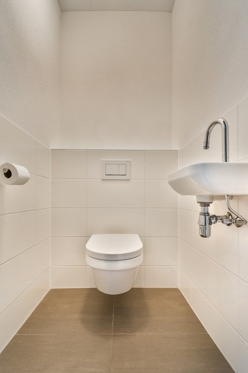 Entree met hal en modern zwevend toilet. Op deze verdieping bevinden zich meerdere slaap- en/of werkkamers en een ruime wasruimte – ideaal voor thuiswerken of een gezinssituatie.