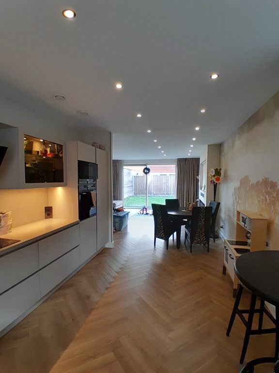 Deze prachtige woning van ca. 165 m² is perfect voor een gezin dat op zoek is naar zowel ruimte als comfort. De woning beschikt over maar liefst zes kamers, verdeeld over drie verdiepingen. De begane grond biedt een ruime hal met een modern toilet en fontein, een open keuken met alle denkbare inbouwapparatuur zoals een oven, inductiekookplaat met afzuiging, vaatwasser en een koelkast/vriezer. De woonkamer met eetkamer biedt een trapkast en een schuifpui naar de tuin.